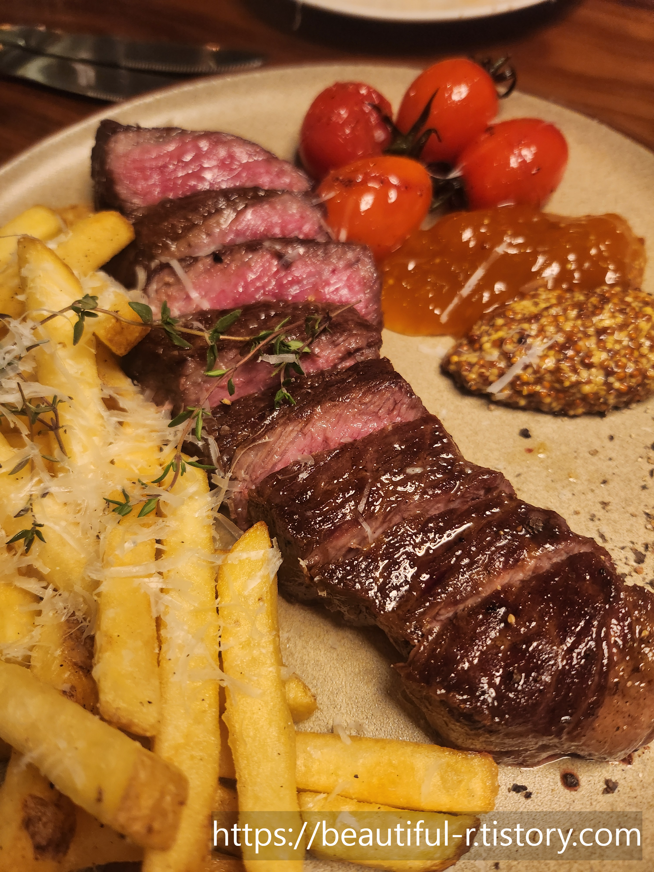 스테이크 종류는 살치살만 있어요. 미디움으로 굽기를 했는데 부드럽고 맛있었어요.