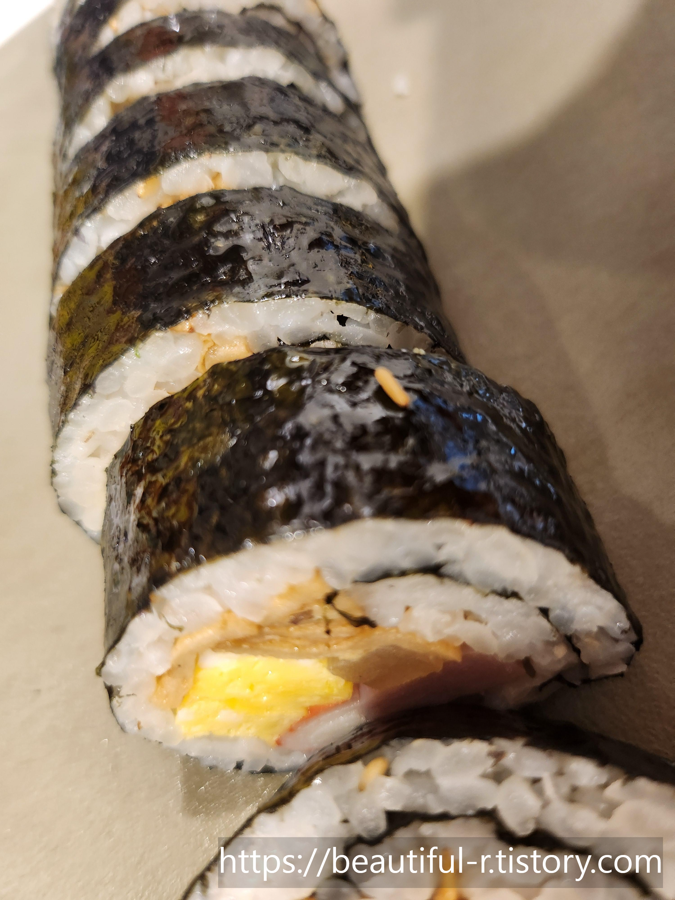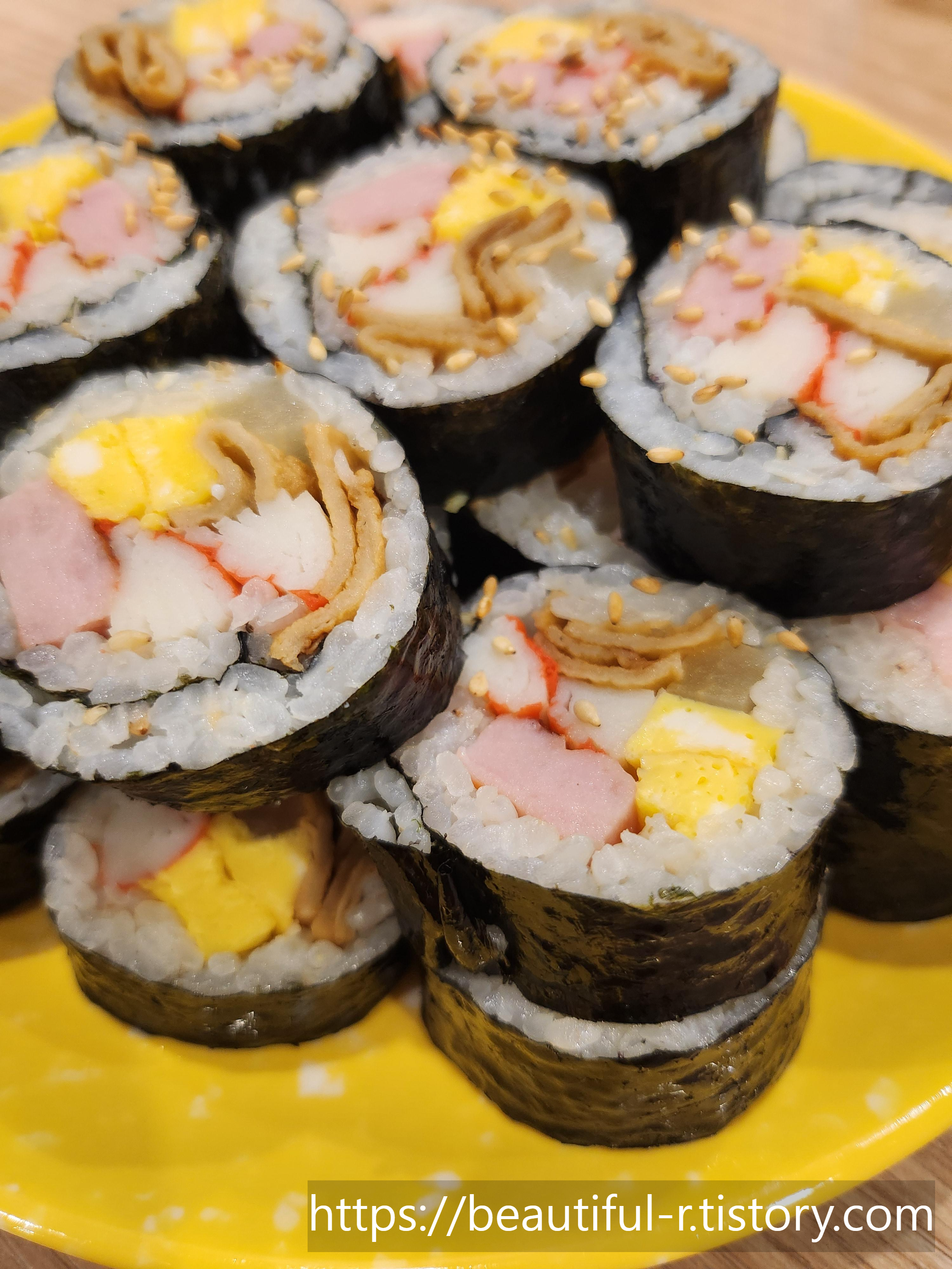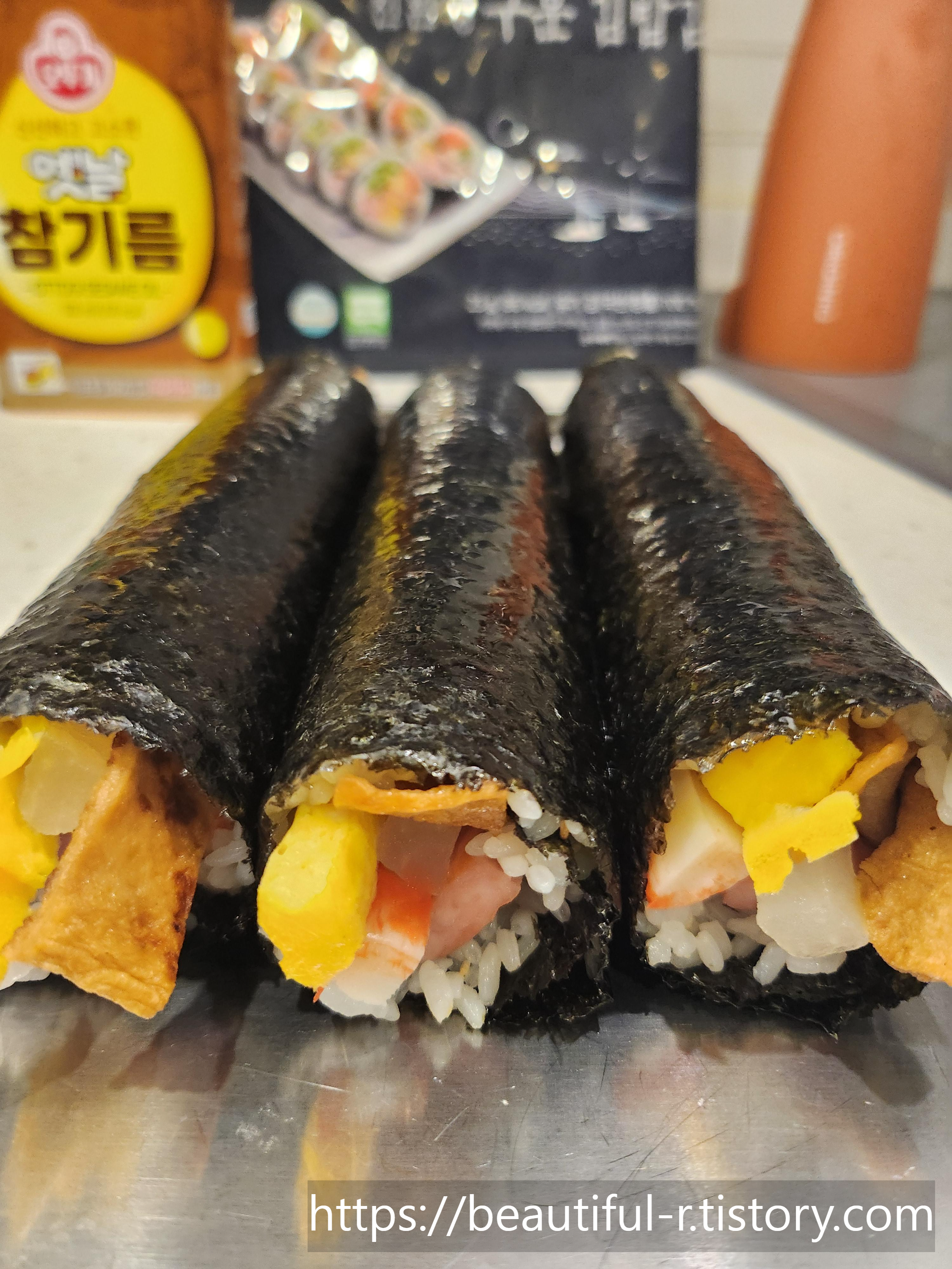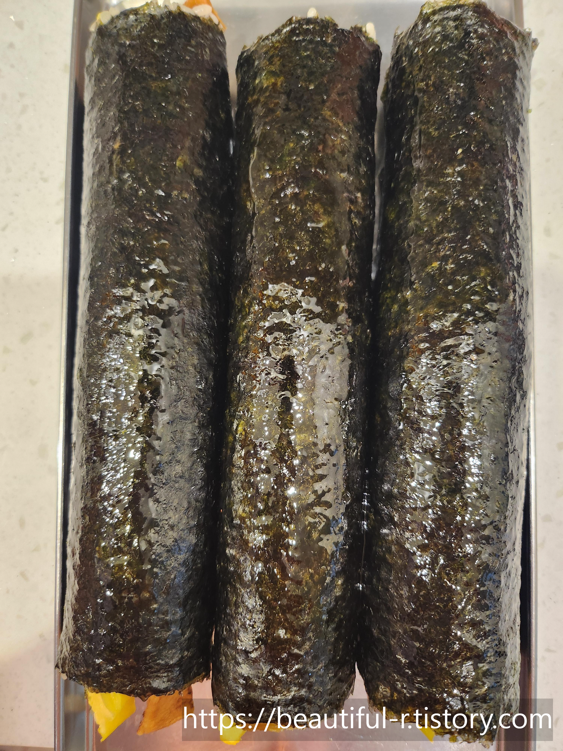 예전에 실패한 김밥 사진 안 찍어둔 게 정말 아쉬워요. 진짜 저의 경우 비포랑 에프터가 확 달랐거든요. 맨날 김밥 터지게 싸던 사람으로서 제가 만든 김밥 보고 또 봐도 예뻐요~ 저 혼자 뿌듯해서 칭찬하는 중입니다.